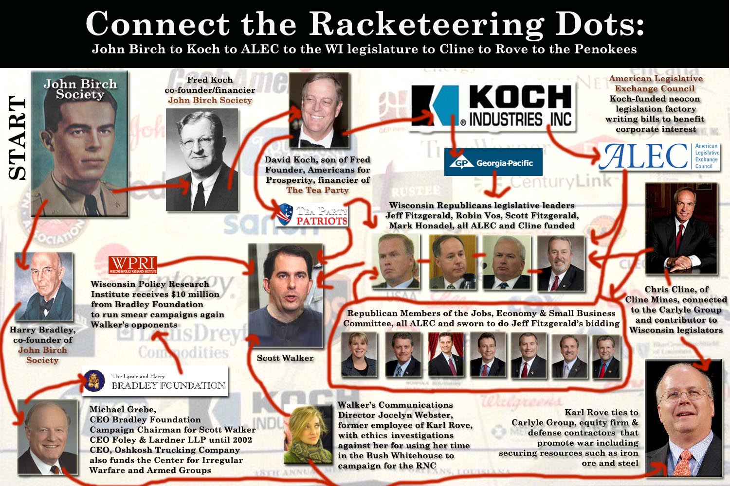 The Penokee Mountains are a veritable gold mine for Cline and Koch, and every subsidiary associated with Wisconsin Manufacturing and Commerce (WMC). Add that Scott Walker has been stacking the DNR with WMC people and you have a lovely example of the cross pollination of the mafia-like web of extortion ALEC appears to have installed.