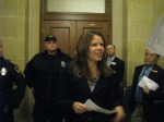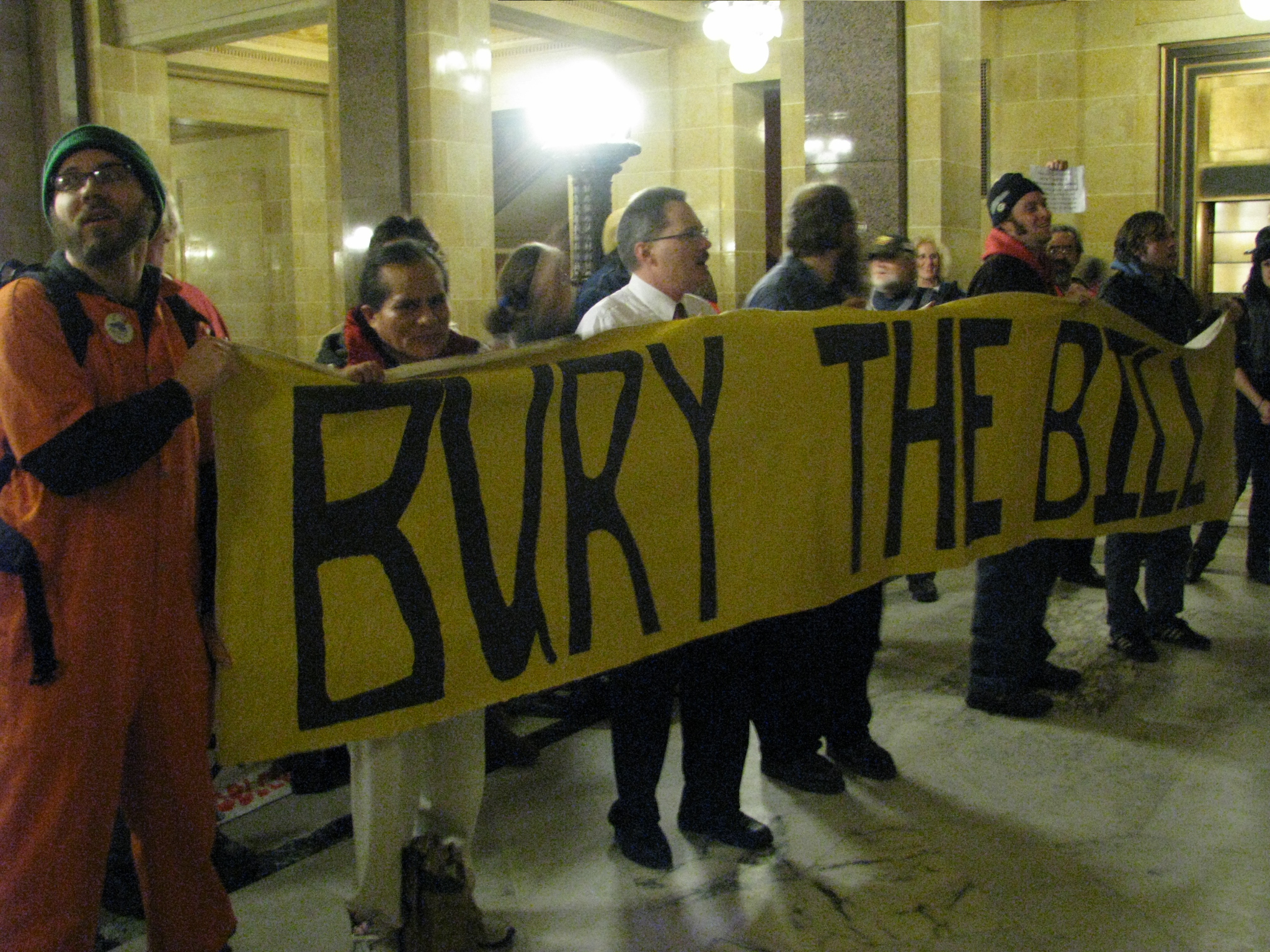 After being forced from the gallery by Capitol Police, State Troopers and DNR Game Wardens, protesters crowded into the area outside the doors to the Assembly chamber, chanting “BURY THE BILL!,” singing, and making as much noise as possible so that those inside could know exactly how their legislation was being received. Representatives Chris Taylor, Kelda Roys and Brett Hulsey came out periodically to talk with protestors and offer their support.