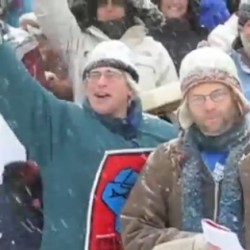 January 22, 2012 by Lady Forward The Solidarity Sing Along singers braved the cold and snow on Friday. They came out and sang (as they have every Monday – Friday, noon to one, since last March) for the people of Wisconsin. On Friday they gave a special shout-out to the workers of America.