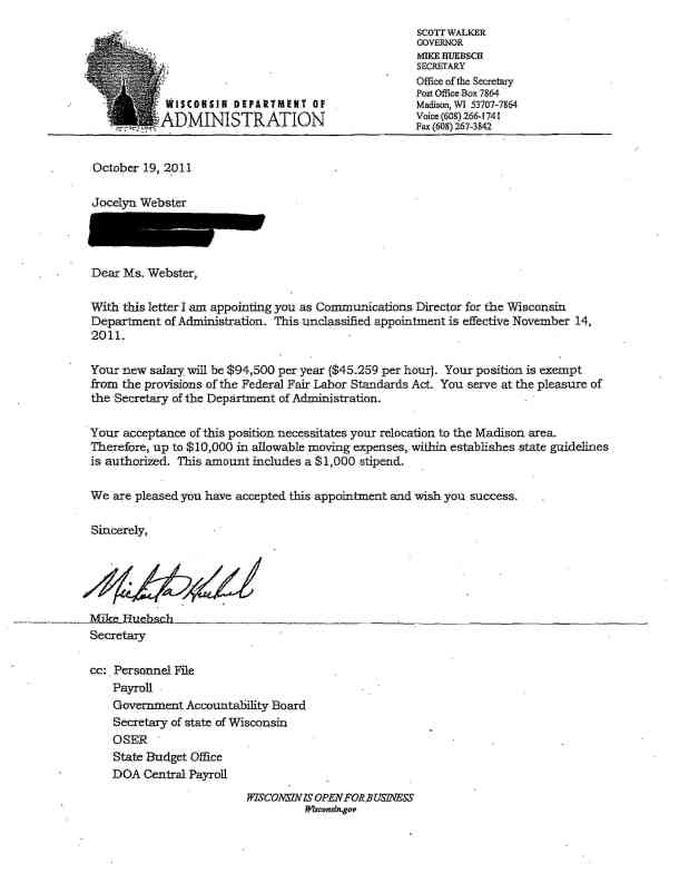 Information on WI Department of Administration (DOA) Director of Communications, obtained through a public records request to the DOA. Her letter of appointment: