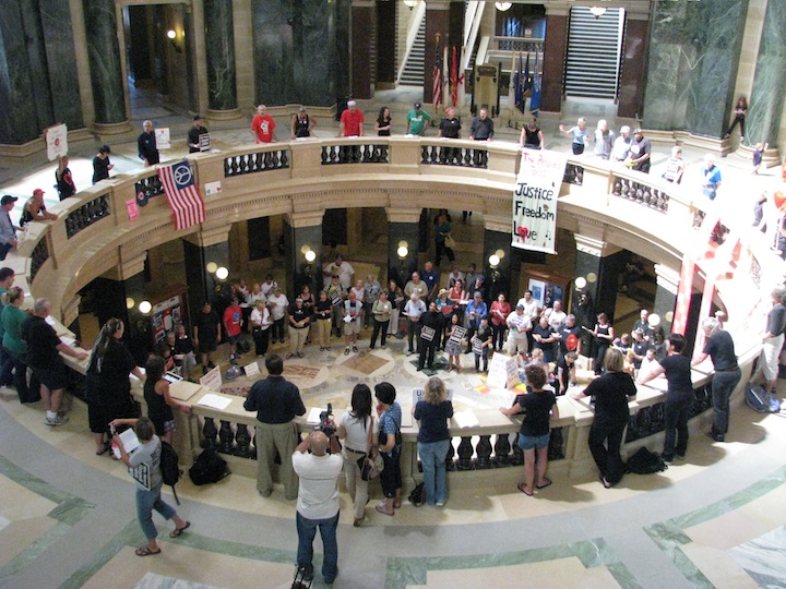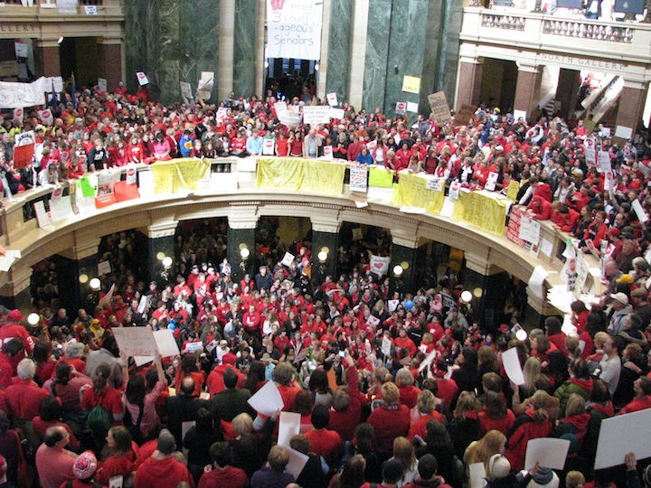 Protesters gather in the capitol rotunda in February 2011 in opposition to Governor Walker's "Budget Repair Bill"