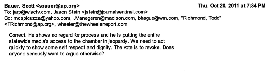 Arthur’s filming in the gallery on October 20th did provoke a response from the WCCA, however. At 3:28 pm Patrick Marley of the Journal Sentinel, sent an email to WCCA president Jason Stein (Journal Sentinel), vice president Scott Bauer (AP) and Todd Richmond (AP), notifying them that Arthur was filming in the Assembly gallery. This precipitated a flurry of emails between WCCA board members (obediently cc’d to legislative officials) and a decision to revoke the press credentials of both Arthur and Sly.