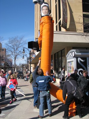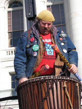 One year after the sudden passage of Act 10, which stripped public workers of collective bargaining rights, the people have mobilized in way that has never been seen in this state. Strong bonds have formed between folks from all walks of life who first met during the capitol occupation last winter or throughout the year on social networking sites. United in their effort to bring democracy back to their capitol, they share information through Facebook, YouTube, Twitter and Skype. Saturday’s rally was a reunion of sorts for many of them, as locals greeted friends who had traveled a great distance to take part in the event, some of whom they had never met in person.