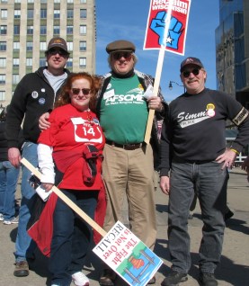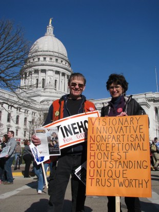 Marching in the peaceful, yet upbeat, crowd yesterday was Roberta Retrum of Eagle River, who personally collected 897 signatures to Recall Governor Scott Walker and Lt.Gov. Rebecca Kleefisch. Art Howell, a photographer, came down from Hudson. Samantha Masterton, a religious education director traveled from Antigo. Terry Fritter marched along with his wife, Patty. Terry is known for the heartfelt testimony he gave at a public hearing back in November. All have been actively involved throughout the year in pushing back against the governor’s agenda.