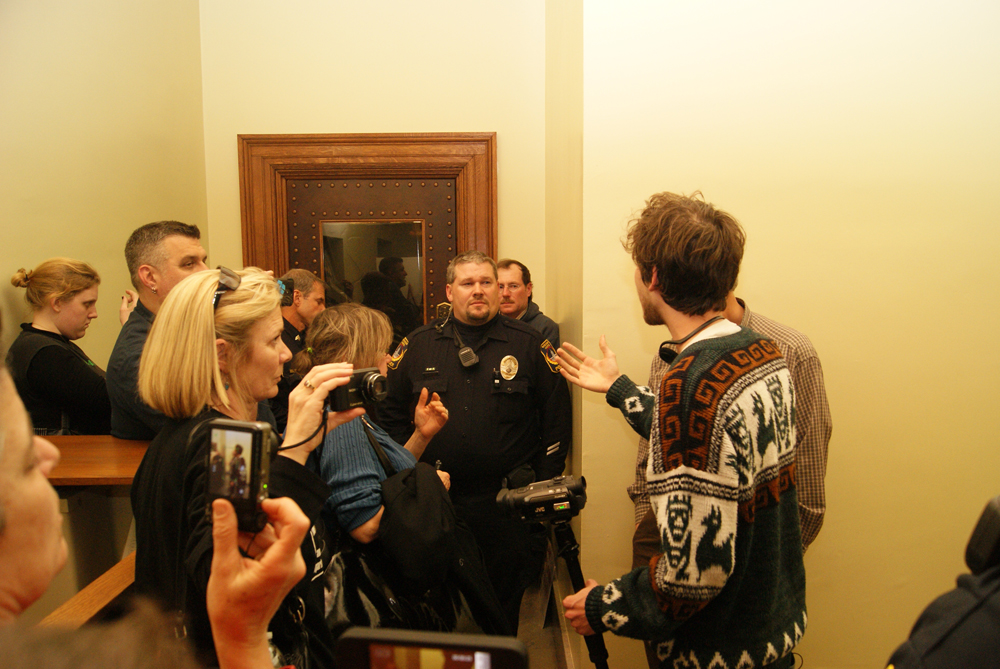 When they took Arthur out of the gallery, the cameras immediately turned on. The whole of the event was caught from multiple angles, one of which is included in the video. Some audio from the actual arrest surfaced as well. Note that there are two times the Capitol Police use force:  once at 5:35, where Arthur is shoved into a door frame as he tries to hear what the Capitol Police are saying to him, and the second time at just before 7:00 when they shove him into the elevator door because it didn’t come fast enough for their liking. He was also trying to call the City of Madison Police to help him.