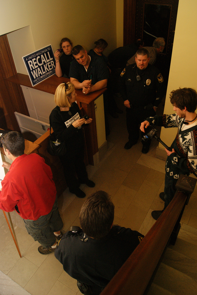 Last night, Arthur Kohl-Riggs, who runs a Facebook Page called ‘Shit Scott Walker is Doing to my State,’ was arrested for having a camera in the gallery.  He’s perhaps best known as the person who shot the video which caused Keith Olbermann to crown Rep. Joel Kleefisch (R-Oconomowoc) The Worst Person in the World.