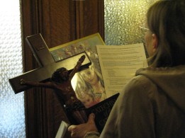 Woman outside of hearing room waiting to testify on SB 237. She sprinkled holy water on people inside the hearing room.