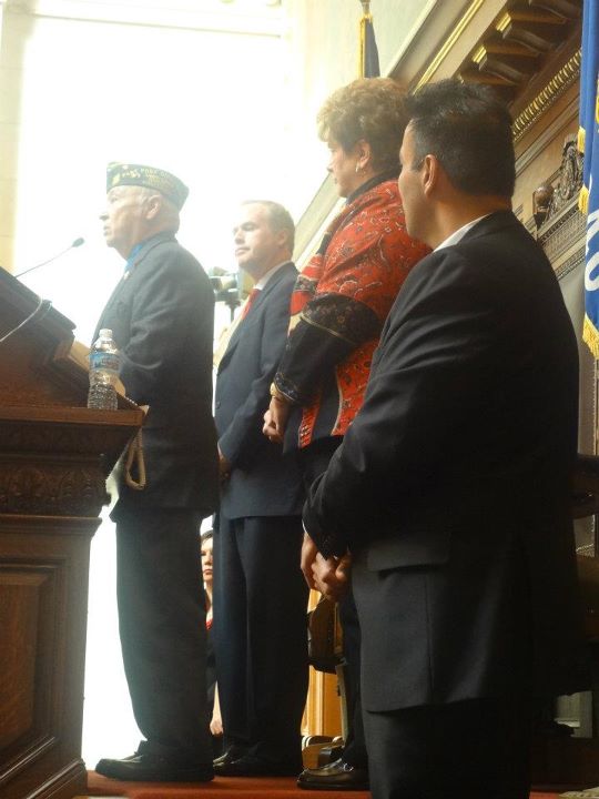 Oneida elder Warren McLester giving invocation in his language “covering the realm of things and the reason why we are here today.” With Jon Greendeer and Rep. Mary Williams (R), chair of the Jobs Committee that passed AB426 though to the Assembly, and Rep. Jeff Fitzgerald (R-ALEC), who on the night of January 26, ordered observers removed from the gallery and the door locked, and illegally passed through a bill that would have decimated the Bad River Tribe.
