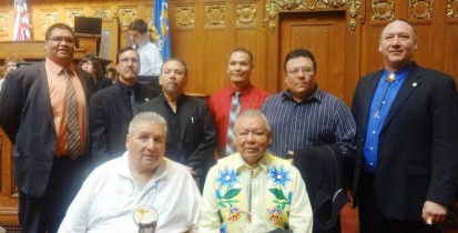 Leaders of the Wisconsin Indian Tribes. From Left: Stewart Bearhart, (St. Croix) Bob Chicks, (Stockbridge-Munsee) Ed Delgago, (Oneida) Craig Corn, (Menominee) Mike Wiggins, (Bad River Ojibwe) Mic Isham, (Great Lake Indian Fish and Wildlife Commission) Front: Tom Maulson (Lac du Flambeau) and Harold “Gus” Frank, (Forest County Potawatomi)