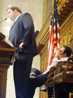 As the night wears on, Rep Tyler August (R-Lake Geneva) takes over the gavel from Speaker Pro Tem Bill Kramer (R-Waukesha) as Rep Joel Kleefisch (R-Oconomowoc) looks on.