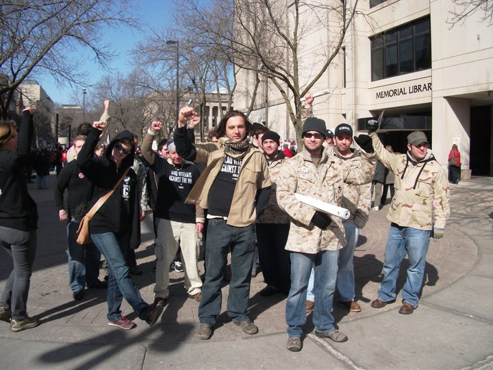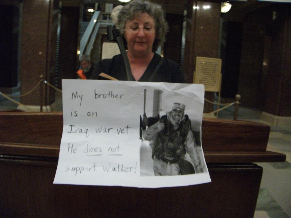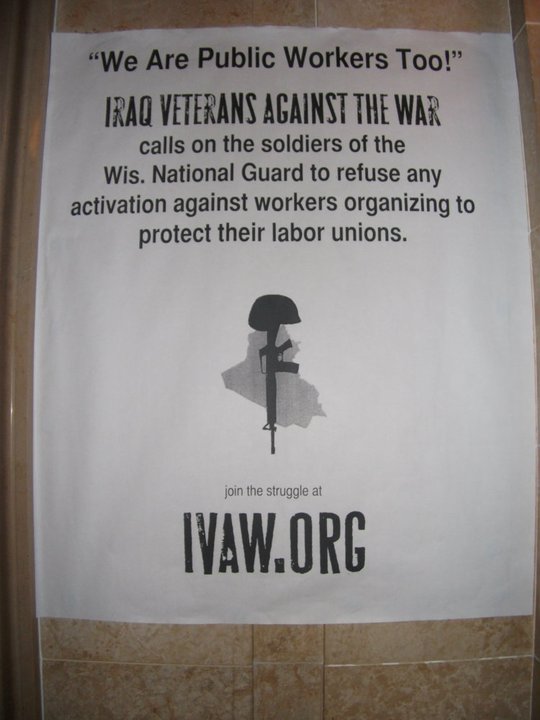 At a rally in March, 2011 women and men Iraq Veterans Against the War protesting Scott Walker's policies say, "Walker, you don't have to call out the National Guard because we're already here!" (photo by Rebecca Kemble)