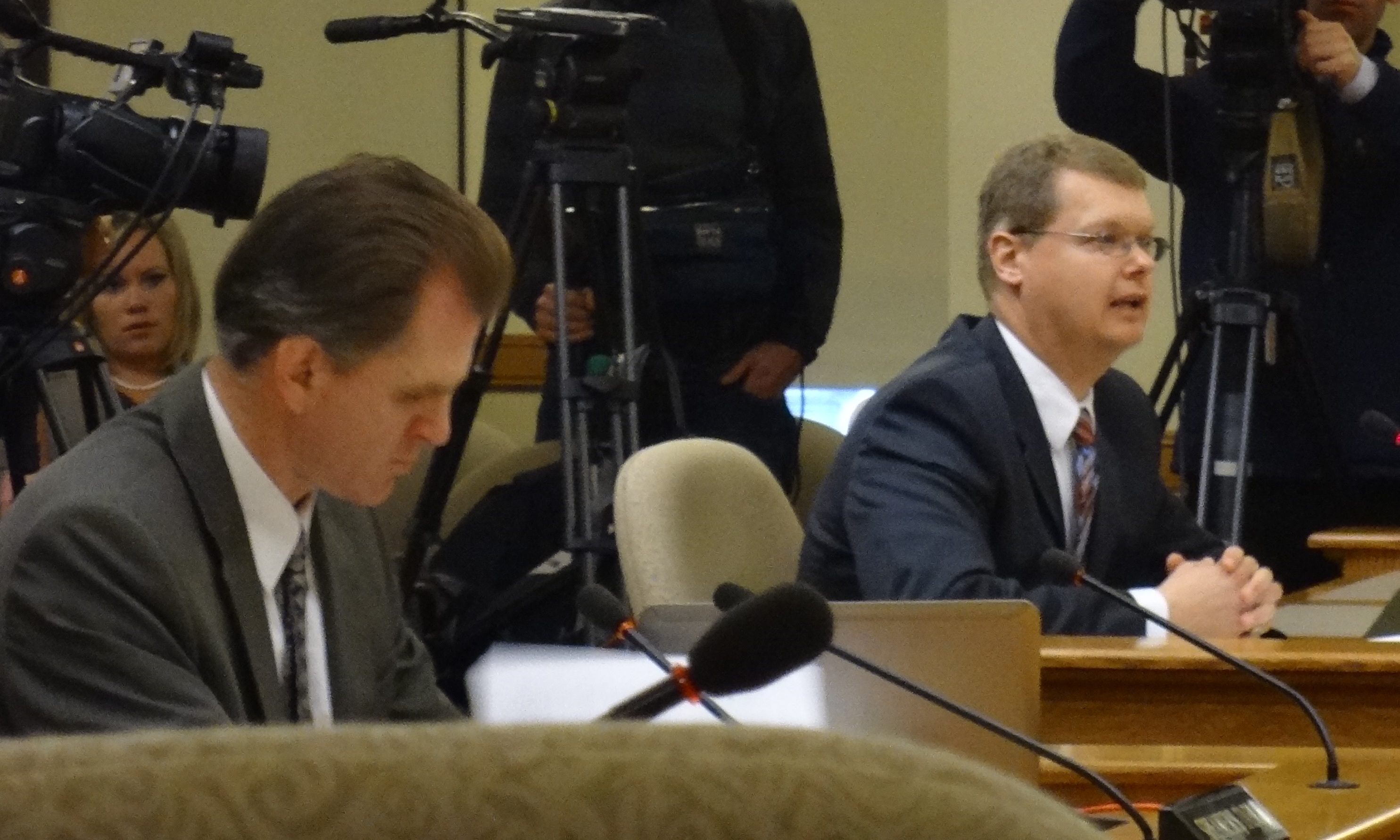 Michael Screnock, attorney for the Walker campaign, addresses the board as GAB attorney Michael Haas looks down.