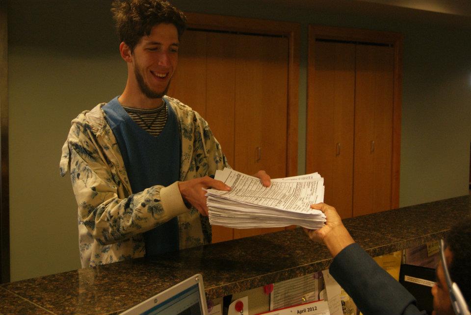 Arthur Kohl-Riggs delivers his first batch of nomination signatures to the GAB, confirming his candidacy for Governor. Photo:Leslie Amsterdam
