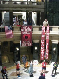 Most of these efforts to intimidate protesting citizens occurred during the local daily equivalent of Pussy Riot singing in church — the Solidarity Sing Along. The SSA is made up of a group of citizens who gather every weekday in the Capitol rotunda at the noon hour to sing protest songs, many of them with new lyrics pointedly focused on Gov. Walker and the Republican regime’s excesses.