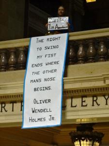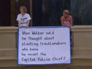 The chief did not say exactly when the crackdown would begin, but the move seemed aimed at protesters citizens such as the “Solidarity Singers Sing Along,” a group of people who gather four days a week every weekday (including holidays) in the rotunda at the Capitol, either in the rotunda or outside near Lady Forward on Carroll Street, to sing songs of peace, love, unions, labor, opposition to Gov. Scott Walker and the GOP, and almost anything else people suggest.