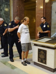 Jason Huberty being arrested for holding text from the Wisconsin Constitution. Photo by Rebecca Kemble