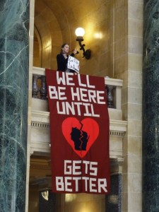 Huberty, Wells and Barwick all assert that singing and holding banners in the Capitol rotunda falls under constitutional protections for free speech and freedom of assembly. When asked why he participates in the Sing Along, Barwick said, “Scott Walker’s policies are offensive to me, my family, my community and overall humanity.” He added, “I have a constitutional right to be here and have my voice heard.”
