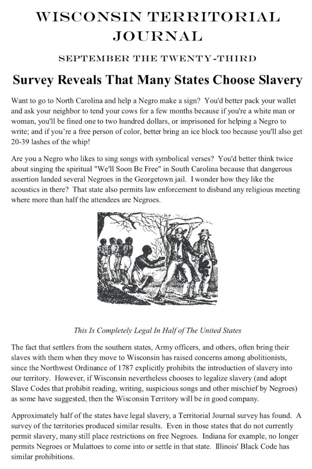 Our research staff surveyed the archives of the State Journal’s predecessor paper, “The Wisconsin Territorial Journal” and conclude that as troubling as Sunday’s story may have been, no one should have been surprised by it. Reprinted below is a story from the Territorial Journal from more than 150 years ago: