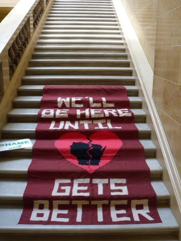 Step by step, day by day. We’ll be here until Wisconsin gets better, broken hearts and all. Lisa Wells displays her banner on a staircase of the WI State Capitol. The banner display has resulted in her receiving citations since the Capitol crackdown began at the beginning of September. Lisa has attended the Solidarity Sing Along since March 2011, documenting almost every noon hour at the Capitol with her popular “Daily” series of photographs and videos. Her “SHAME” and “2nd Floor, 1st Amendment” signs are spotted everywhere during the noon hour song circle. Photo: Lisa Wells.