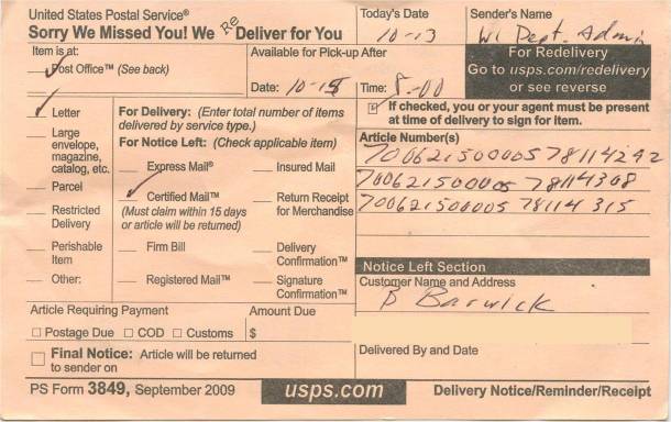 Barwick received a delivery notice (above) for certified mail from the Department of Administration on Saturday, October 13th. He is unable to pick up the three letters until Monday morning, but they are likely additional citations for having conducted the Solidarity Sing Along. Barwick was targeted by the Capitol Police in September, having received three citations for violating 2.14(2)(v), and one for 2.14(2)(k) “disorderly conduct.” The latter and one of the “no permit” citations were issued for a spontaneous event that took place inside the Capitol after a Friday sing along outside had ended. Barwick has not been dissuaded by these citations and has continued to conduct the Sing Along.