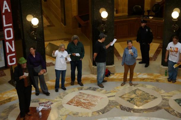 Officer Andrew Hyatt of WI Capitol police surveys the scene and takes notes during the noon hour song circle in the Capitol on Tuesday, October 9, 2012. Brandon Barwick, on the left in the green fedora, received a citation via certified mail today for: Obstruct Access Passage (No Permit). Admin Code 2.14(2)(v). The citation was issued by Ofc. Andrew Hyatt. A court date has been set for early November. Photo: Leslie Amsterdam