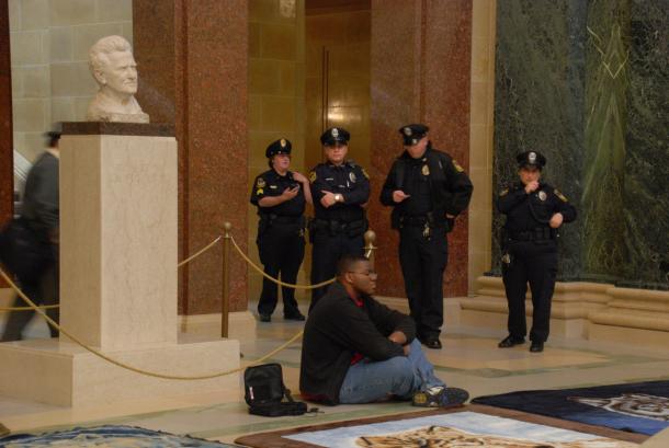 A young Madison man, Dwayne, was arrested, cited and released Monday at the Capitol for protesting the start of the legal wolf hunting season. His display of tapestries and soft music was determined to be against administrative code 2.14(2)(v) for “Obstructing access/passage-No permit”. Two officers handcuffed the peaceful protester, while several other officers gathered his belongings and secured the scene. Photo: Dawn Henke.