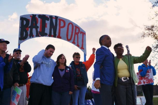 The Reverend Al Sharpton stands alongside Dot, a longtime Sensata Technologies worker and other citizens arrested in recent civil disobedience actions related to Sensata outsourcing all jobs to China by the end of the year. The encampment set up outside the Freeport, Illinois plant is receiving national attention. Learn more at Bainport.com. Photo: Leslie Amsterdam