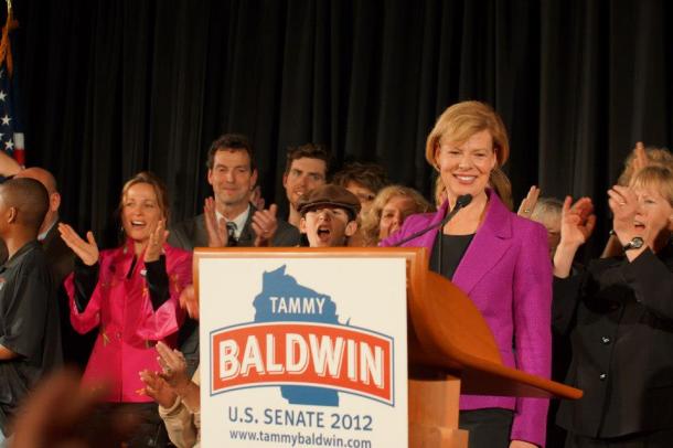 Tammy Baldwin takes in the moment after her victory speech at Monona Terrace in Madison Tuesday night. Baldwin becomes the first woman elected to the US Senate from Wisconsin and the first openly gay member to serve in the Senate. She defeated former Wisconsin governor Tommy Thompson to continue representing the people of Wisconsin in Washington DC.