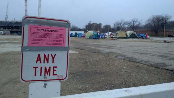 This No Trespassing sign has been posted at the current Occupy Madison location on the 800 block of E. Washington Avenue, directly east of last year’s encampment. On Thursday, Madison police informed campers that they must leave by 3pm Sunday or risk eviction and a Trespassing citation. Occupy Madison is meeting on Saturday at the site to discuss moving plans, as there is no legal place for these people to reside while they seek permanent housing solutions.