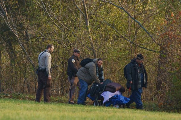 Franjo Mastoric and a fellow Occupy Madison camper are escorted off the grounds of Lake View Hill Park by Dane County Sheriffs deputies during the eviction of the Occupy encampment on Tuesday morning by County Parks and Sheriffs staff. The camp was moved out to Token Creek Park involuntarily 2 days before Thanksgiving. Token Creek Park is located north of Madison and is not considered an appropriate location for the group as there is no access to public transportation or community services. Photo: Leslie Amsterdam