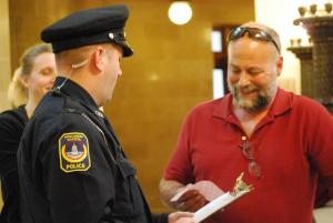 UPDATE: On Wednesday, Officer Hyatt served the fifth citation for the 11/16 chalking incident to Bart Munger during the noon hour Solidarity Sing Along. Munger accepted his citation with a smile while the singers one floor below looked on. This marks the first time that Capitol police have served a citation during the song circle. Previously, they had refrained from such activities noting a lack of sufficient personnel should there be a security concern. There was no incident during the citation service and a round of applause for Munger followed the officers’ departure.