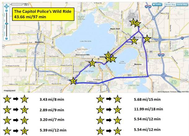 The map below shows one possible route utilized by Officer Hyatt on Tuesday afternoon and evening. He left the Capitol with the officer that he was training just after 4 pm and ended up on the far northeast side – without the extra officer and in a different vehicle – at about 8:30 pm. At some point during the afternoon he returned the officer in training to the Capitol and changed vehicles.