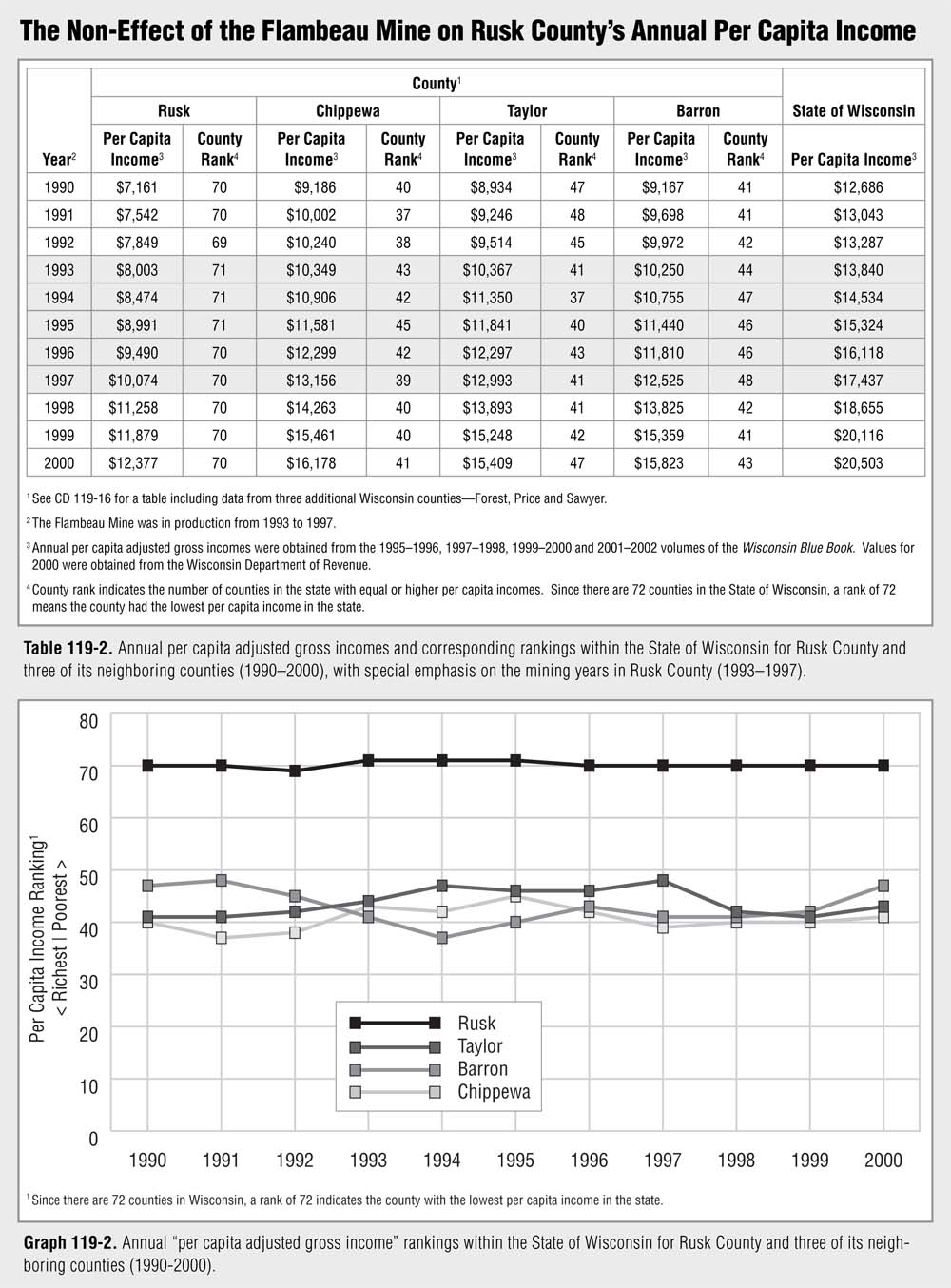 Equally significant when looking at the health of a local economy is the annual per capita income. As much as the citizens of Rusk County were told over and over how much a mine would increase their economic prosperity, the county’s annual per capita income, relative to the other counties in the state, actually decreased during the years Flambeau operated.