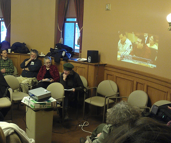 Citizens watch Mike Wiggins Jr. testify against SB1/AB1 from an overflow room at the Capitol, Madison WI, January 23, 2013. Photo: Barbara With