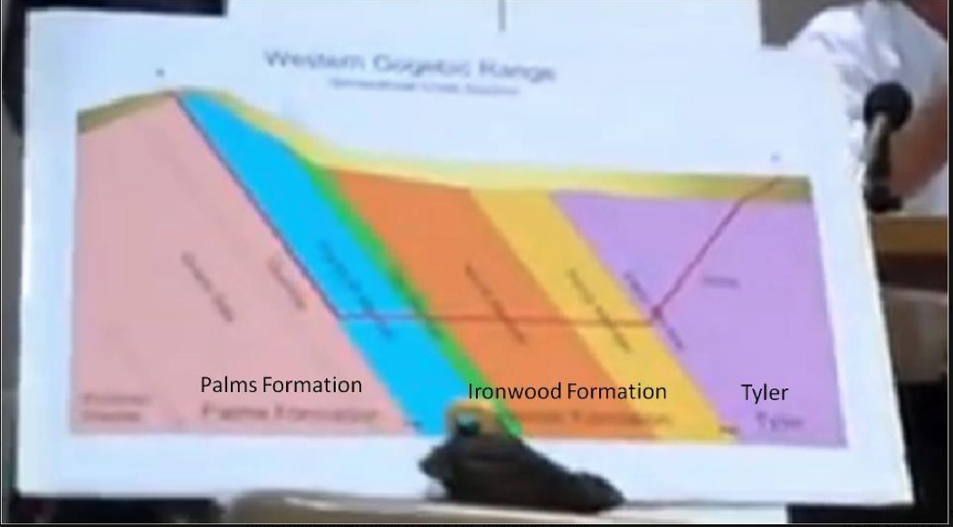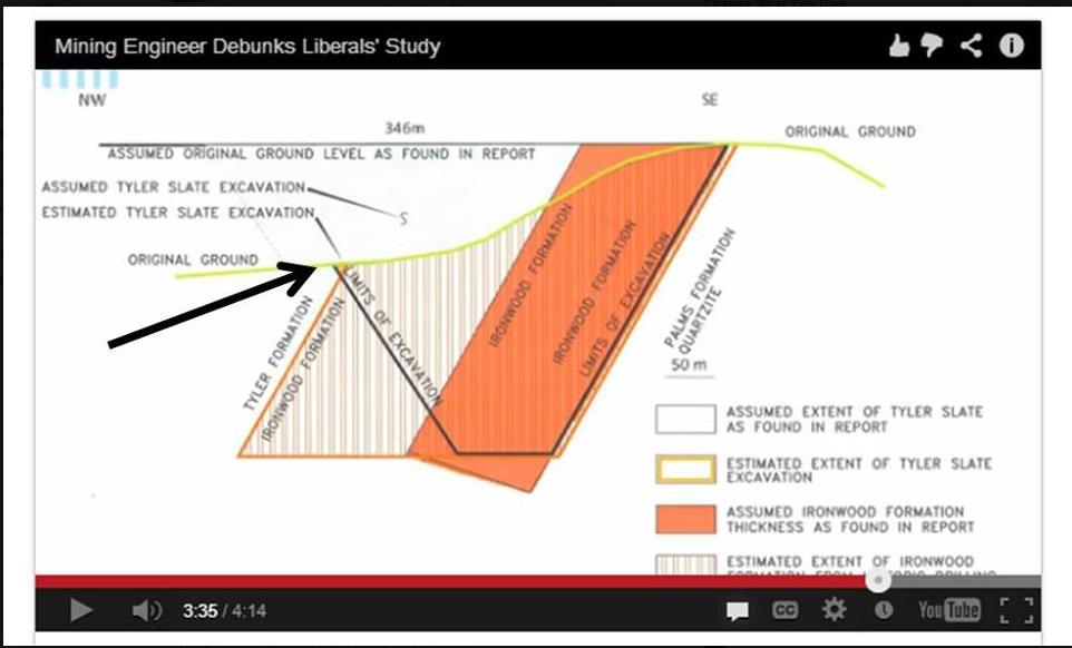 Figure 4. Screen capture of the cross section of the proposed Penokee iron mine shown by Bill Williams during a public presentation on the project. This is the Diagram that GTac circulated before questions were raised about pyrite in the Tyler Slate. The entire north wall of the mine is in the Tyler Slate.