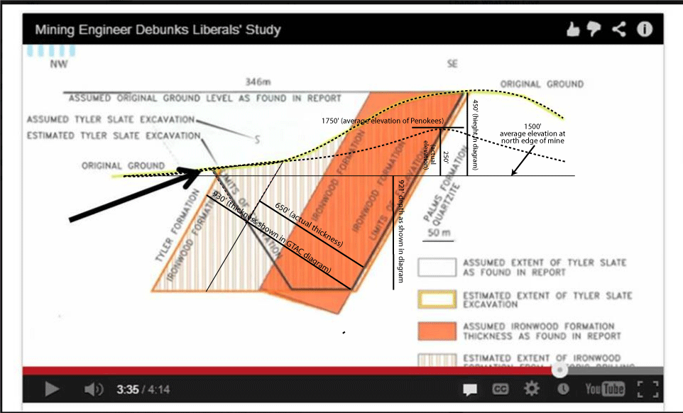 Figure 1: The diagram of the proposed Penokee mine used by GTac in recent legislative hearings. This image is taken from a presentation prepared by the corporate funded right wing “MacIver Institute,” which added the description “Mining Engineer Debunks Liberals’ Study.” The MacIver presentation demonstrates how the diagram is being used to discredit mining critics.