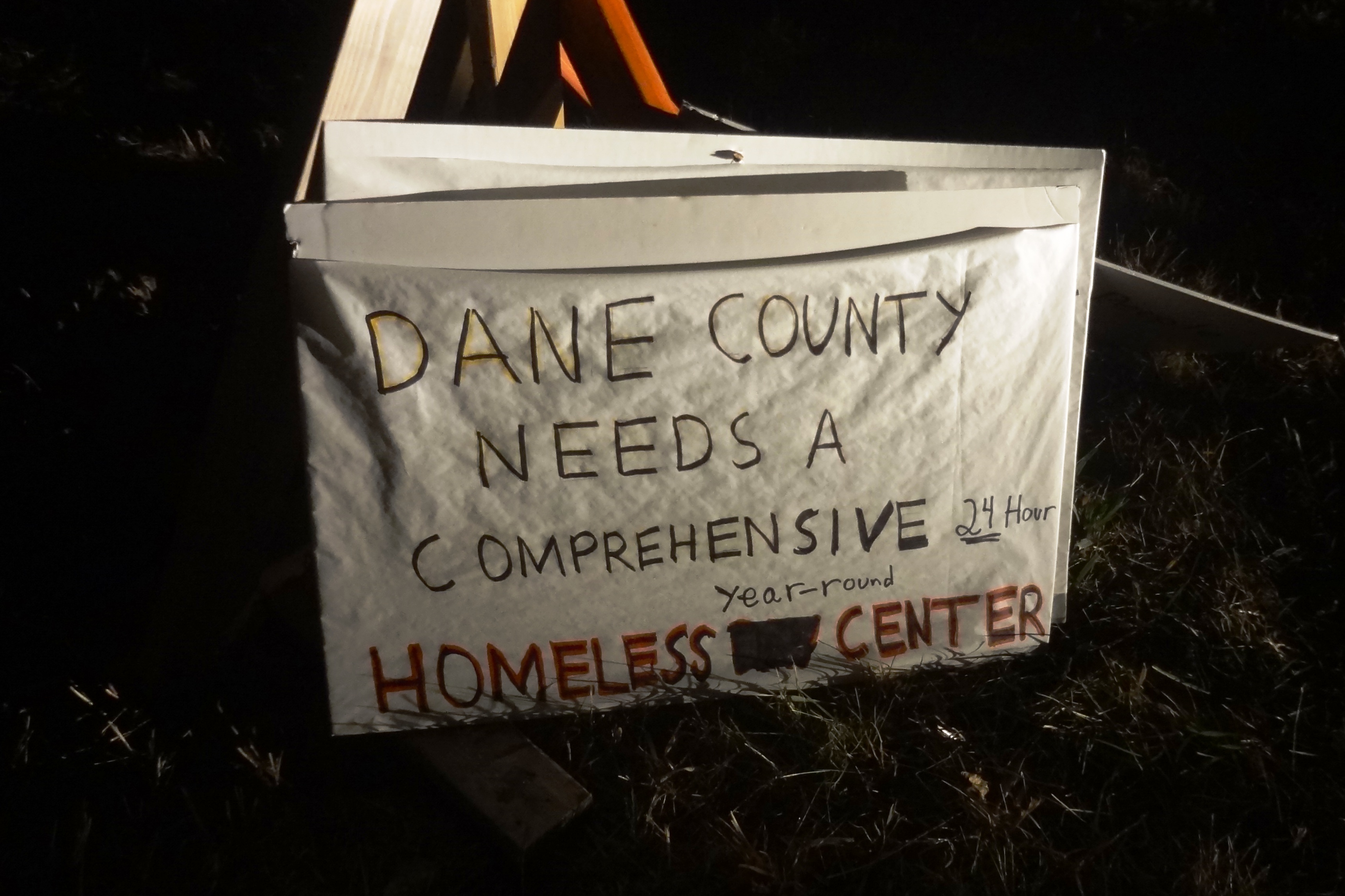 “Wake Up to Illegal Sleep,” says the sign that describes the experience of members of Madison’s homeless community. Photo by Rebecca Kemble