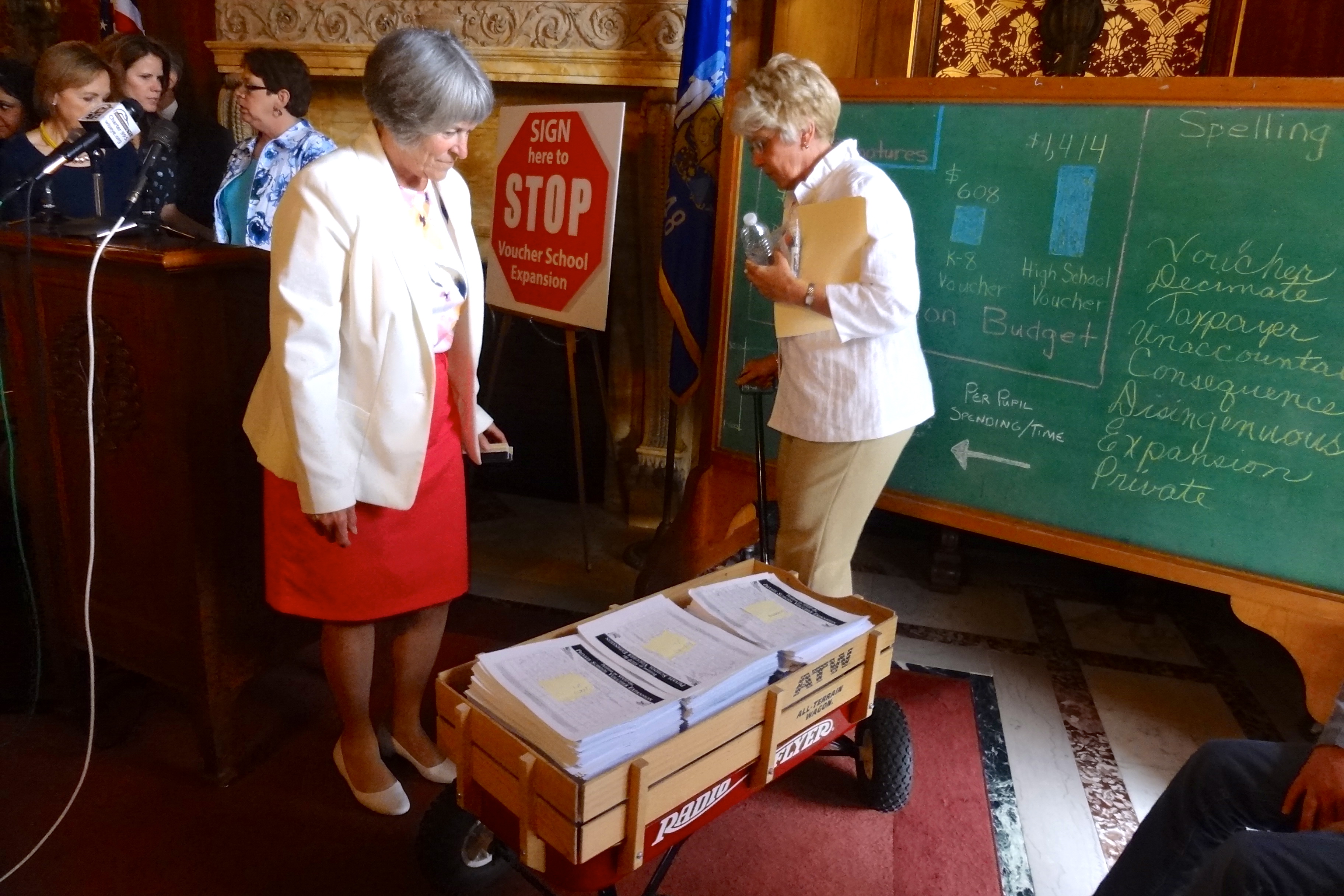 Earlier today a group of legislators and public school advocates delivered a wagon load of petitions to Governor Scott Walker and the Co-chairs of the Joint Finance Committee urging them to remove school voucher expansion plans from the 2013-2015 state budget.