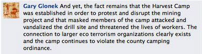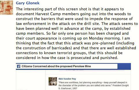 On a Facebook post by Nick Vander Puy regarding the building of wigwams for elders at Harvest Camp, Glonek insinuates that members of the LCO tribe, including an elder of the tribe Tom Corbine, were actually constructing barriers “that were used to impede the response of law enforcement” and claims there are “well-established connections to known terrorist groups.” He also claims to know that the incident was “planned well in advance … by established members of the camp.”