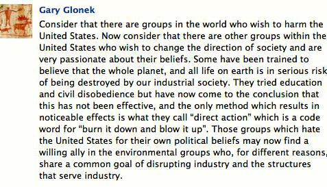 Regarding an incident that took place on June 11, when an unidentified group harassed GTac contractors drilling for core samples, Glonek has now determined that they were “terrorists” who “hate America.”