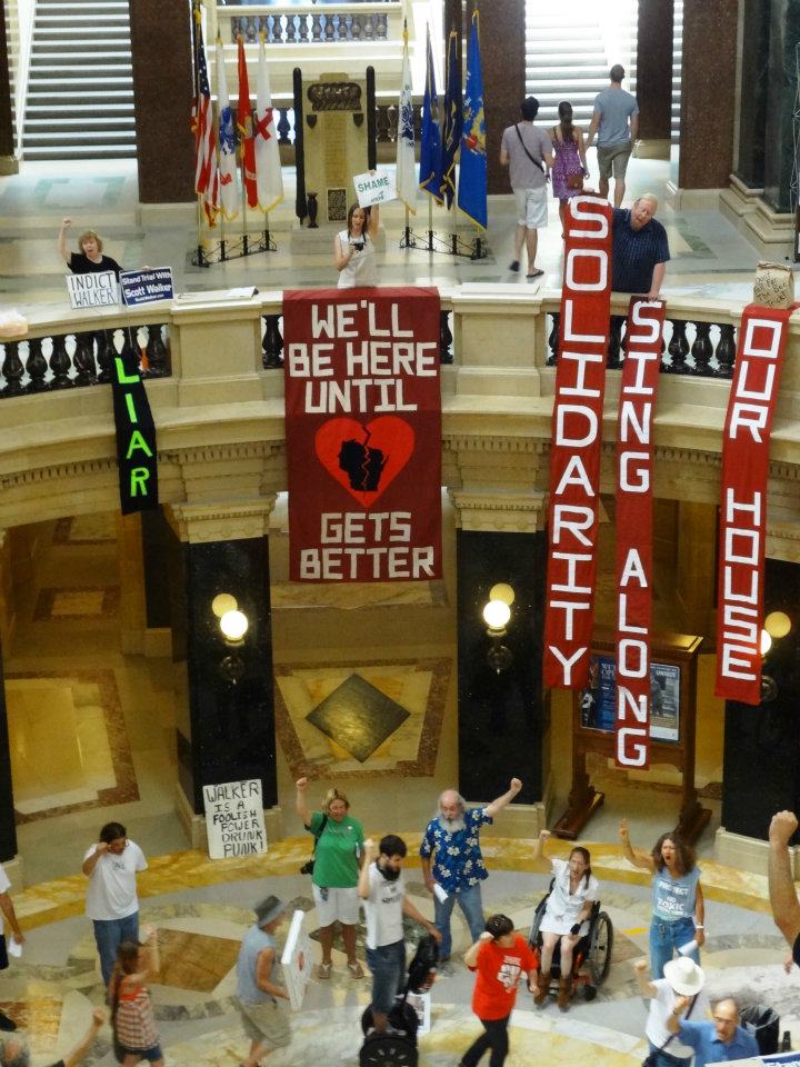 Citizens continue to come to the Capitol because they still feel locked out of the process. Most of the “bold reforms” that Walker touts end up in court. Decisions are made behind closed caucus doors, and my own Assembly representative is limited to two minutes of time on the floor. Am I being represented if my elected official is suppressed by the “gerry-mandated” majority? It is quite obvious that the Republican Party is not listening. But when I sing in the Capitol, I know they can at least hear me.