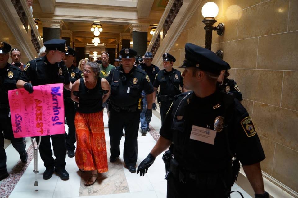 This was not the first time that a peaceful dissenter experienced a medical emergency while handcuffed in police custody. Last September, disabled veteran Dawn Henke collapsed while being swarmed by police as she exited the building. A legislative aide to Rep. Mary Williams (R-Ladysmith) had pushed the newly installed panic button in her office when she heard singing in the hallway.