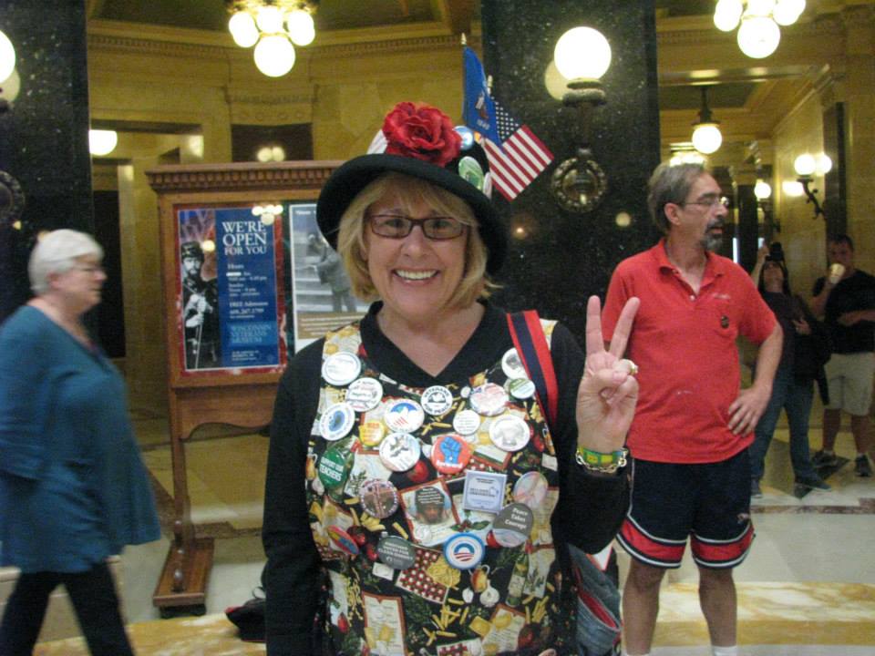 Marie Martini, a member of The Raging Grannies of Madison, and Margit Moses, of Madison, were arrested by Capitol Police for singing in the rotunda today over the noon hour. The arrests took place during a rousing rendition of “Bring Back Wisconsin to Me,” which is sung to the tune of “My Bonnie Lies Over the Ocean.”