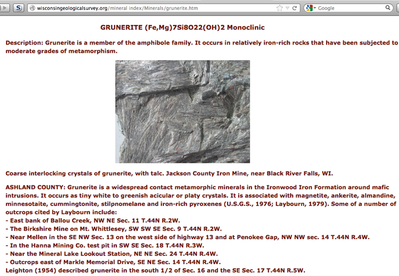 According to the National Academy of Sciences, grunerite is one of the most toxic forms of asbestos and causes lung cancer, mesothelioma and pulmonary fibrosis. The Wisconsin Geological Survey states on its website that grunerite is found throughout the Mellen area on and near the proposed mine site. (see above)