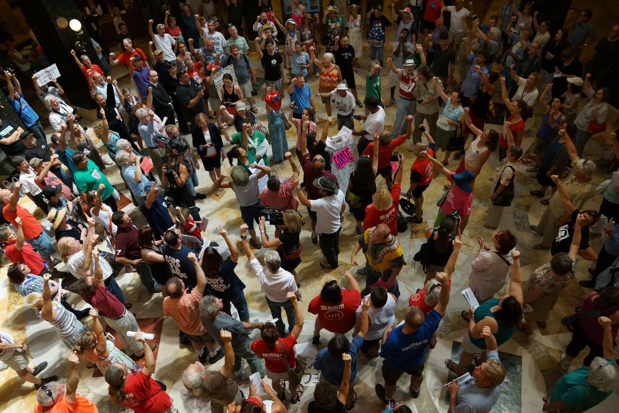 The Journal Sentinel also ran an article on August 14 titled “State: no arrests in rotunda protests, but thousands spent for chalk removal.” The article explains that on Wednesday August 14, a man from St. Paul Minnesota had taken out a permit on behalf of the “Solidarity Singers.” The fact that a permit was taken out, as was the case previously, prompted the Capitol Police to refrain from declaring an unlawful assembly.