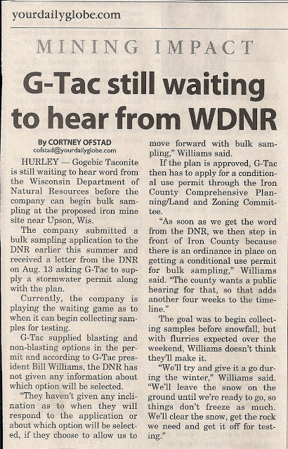 Yet, on Saturday, Oct 19th, The Globe reported that “Gogebic Taconite is still waiting to hear word from the Wisconsin Department of Natural Resources before the company can begin bulk sampling at the proposed iron mine site near Upson, Wis.” Bill Williams claims the “DNR has given no inclination as to when they will respond.” The implication is that WDNR is delaying the process, when actually, it is GTac that has not yet submitted the required information to WDNR.
