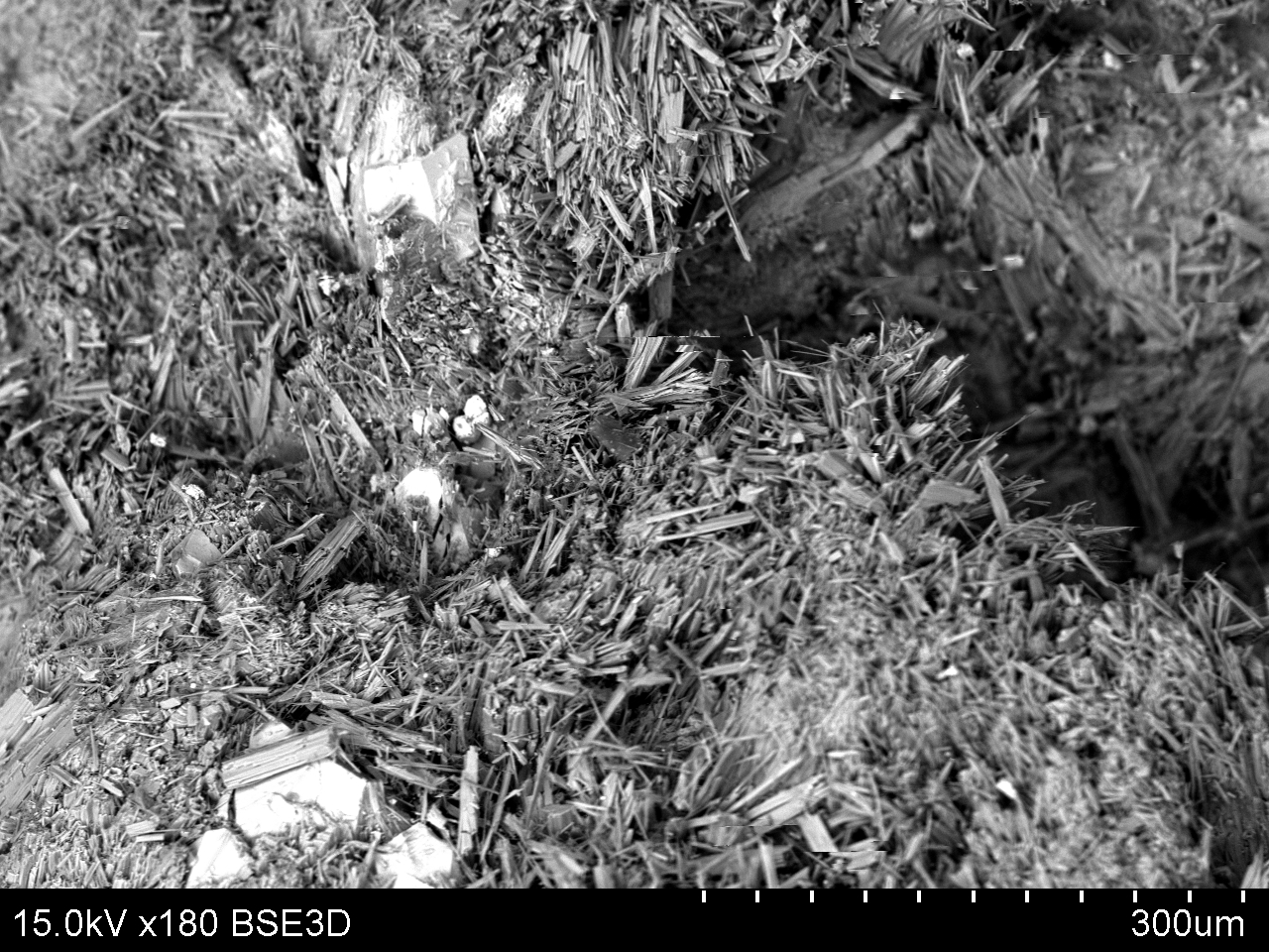 Microscopic images of asbestiform grunerite, one of the most dangerous forms of asbestos, from the site of GTac’s proposed iron mine. Above: scanning electron microscope (SEM) made at UW-Madison by the Wisconsin Geological and Natural History Survey. Below: a crude but revealing cross polarized light microscope image of a different sample collected at the mine site by Dr. Skulan.