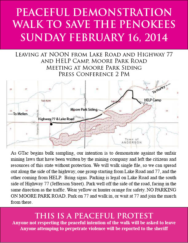 Moore Park Siding, Wisconsin – Wisconsin citizens working to protect the pristine environment of the Penokee Range in Northern Wisconsin from morally illegitimate mining exploration and socially unacceptable environment degradation will gather on Sunday, February 16 from 1-3 PM to help bring public awareness to the proposed destruction of Wisconsin’s natural resources.