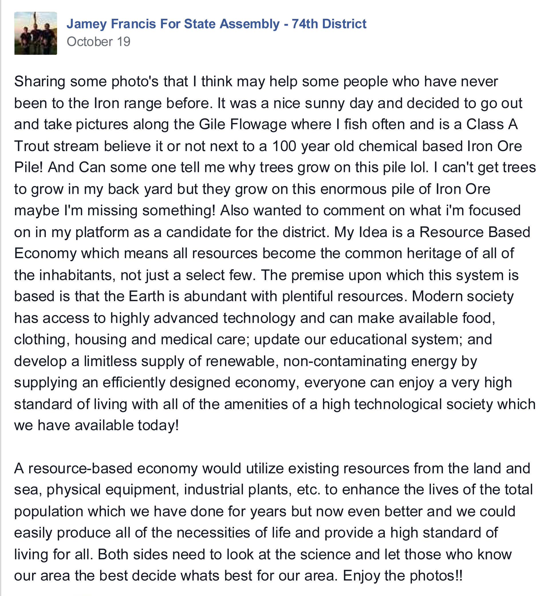 However, in a recent post on his Facebook page, Francis plagiarized a quasi-communist organization in an attempt to rationalize his support for Gogebic Taconite (GTAC)’s proposed open pit mountaintop removal iron ore mine in the middle of the Bad River watershed.