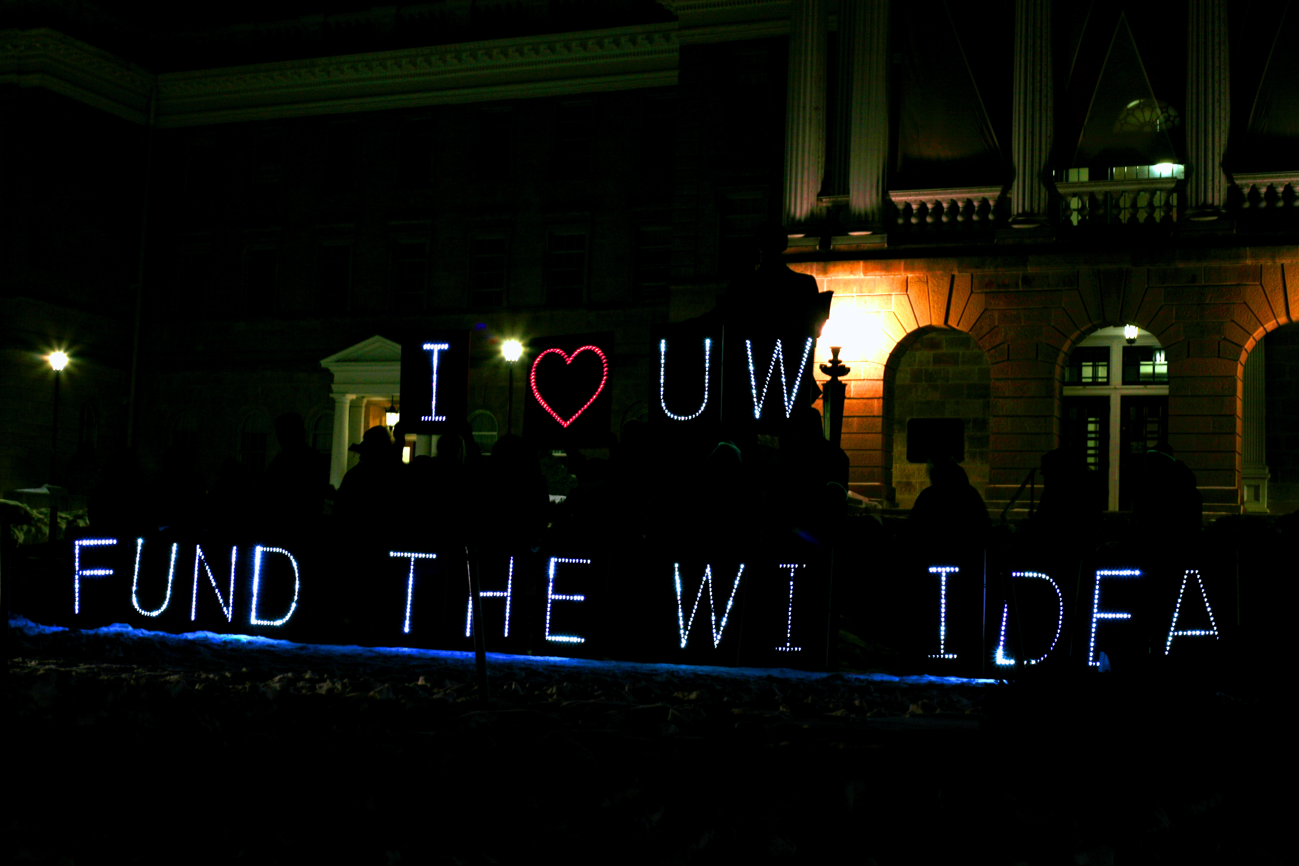 All speeches touched on the central theme of how budget cuts to public education institutions disproportionately affect particular communities and how all citizens must stand up and demand change and the necessary investments in our future or “shut it down”. Overpass Light Brigade hosted an evening vigil on Bascom Hill where the illuminated message I❤️UW and Fund the Wisconsin Idea warmed up a dangerously cold evening. Here are more of the sights and sounds:
